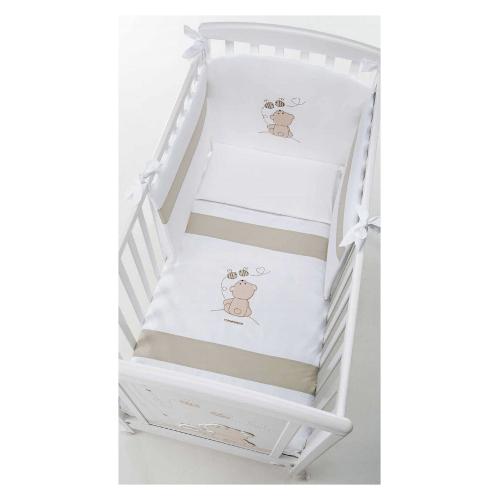 Il completo piumone golosone di foppapedretti è caratterizzato da ricami con un orsetto goloso e due simpatiche apine, nelle tinte del beige
