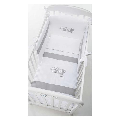 Il completo piumone piccoli amici di foppapedretti è caratterizzato da ricami con due piccoli amici: un dolcissimo coniglietto e un simpatico orsetto che giocano con alcune stelline, nelle tinte del grigio.