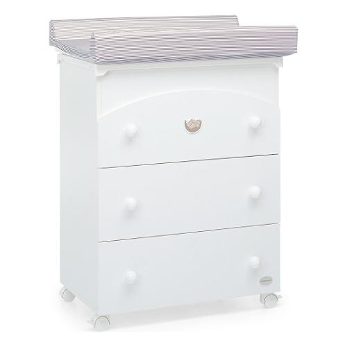 Bagnetto/fasciatoio dotato di piano ribaltabile con sistema di sicurezza ammortizzato, vaschetta anatomica estraibile. Decoro applicabile a piacimento. Dimensioni materassino fasciatoio incluso: h 9 x p 50 x l 72 cm