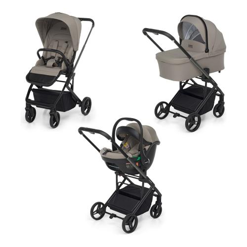 Sul leggero telaio in alluminio self standing con dettagli cromati possono essere montati la navicella spaziosa, interno sfoderabile e pieghevole per chiusura compatta, poi la seduta passeggino reversibile e chiudibile fronte strada e fronte mamma con schienale areato, utilizzabile fin dalla nascita, e il seggiolino auto i-size per i primi mesi (per bambini da 40 a 87 cm di altezza, max 13 kg).