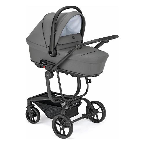 Carrozzina molto ampia dotata di sistema di aggancio/sgancio rapido con schienale reclinabile in 3 posizioni con una sola mano. Seggiolino Area Zero+ omologato secondo la normativa R-129 I-Size (da 40 a 75 cm) con pratico meccanismo di regolazione automatica in altezza della cinghia a 5 punti.