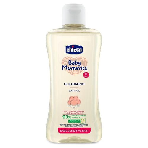 L’olio da bagno Chicco Baby Moments è formulato con il 93% di ingredienti naturali per rispettare l’equilibrio idrolipidico della pelle del neonato.