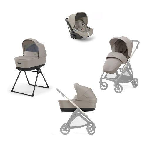 Completo di welcome pad, coprigambe per passeggino, cestino portaoggetti e portabibite, supporto stand-up per culla