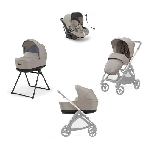Completo di welcome pad, coprigambe per passeggino, cestino portaoggetti e portabibite, supporto stand-up per culla