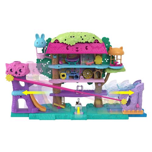 Il playset Polly Pocket™ Pollyville™ Casa sull'Albero dei Cuccioli™ è un concentrato di divertimento e attività per i cuccioli. Esplora i 5 divertentissimi piani fatti apposta per i cuccioli! Inoltre, grazie a una funzione molto originale, puoi far prendere vita alla casa sull'albero ideale: guida il veicolo a forma di cigno sopra un dissuasore di velocità e fai espandere il playset attivando una zipline; continua a guidare oltre un secondo dissuasore per rivelare uno scivolo con cascata. Ogni piano del playset nasconde posticini segreti e divertenti sorprese; include inoltre 2 micro bambole, 4 adorabili animaletti, 9 accessori e 1 veicolo a forma di cigno. I cinque piani includono: la piattaforma della zipline e il vialetto di accesso (sotto la torre), il percorso a ostacoli per i cuccioli, l'area di ristoro dei cuccioli con la zona relax, la camera da letto con bagno e water, la zona pranzo all'interno del gazebo a forma di volpe e l'area panoramica ribaltabile sulla cima degli alberi.Scopri tante attività divertenti, come lo scivolo di emergenza nascosto all'interno della cuccia per cani, l'area per arrampicarsi, quella per fare un giro sulla mongolfiera a forma di coniglietto, uno scivolo estendibile con cascata, l'altalena fatta a cesta, un vano segreto sulla cima dell'albero all'interno del tetto, e molto altro ancora!