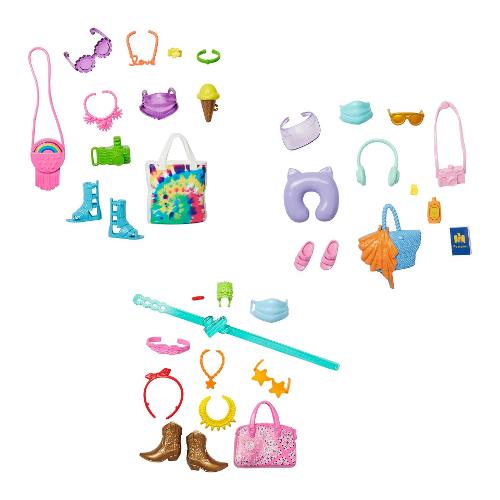 Con i set di accessori alla moda, barbie® sarà sempre pronta per qualsiasi avventura (bambola non inclusa; in vendita separatamente, secondo disponibilità). Ogni set include 11 accessori a tema per arricchire le tue storie di gioco con stile e tanti dettagli creativi! Potrai scegliere tra diversi temi ispirati al pattinaggio a rotelle, all'oceano, agli animali o alle serate fuori con le amiche! Ci sono tanti accessori trendy, tra cui una visiera argentata nel set ispirato all'oceano o una borsa a forma di bocca per la serata con le amiche.Gli Altri pezzi ispirano ancor di più le tue storie, come una borsa a forma di cuore arcobaleno nel set del pattinaggio a rotelle e un cucciolo nel set della natura selvaggia.