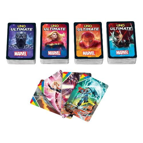 Scopri quali supereroi puoi abbinare con il gioco di carte uno ultimate™ marvel! Ogni supereroe gioca con regole e poteri speciali che si applicano al proprio mazzo, con 4 personaggi tra cui scegliere: capitan marvel, iron man, black panther e thor! Come nel classico gioco uno®, i giocatori abbinano colori, numeri e simboli alla carta in cima al mazzo di scarto, ma in questa versione possono utilizzare i loro poteri speciali a ogni turno! Le carte 'evento', 'nemico' e 'oggetto' del mazzo pericolo possono davvero cambiare il gioco!Include 4 carte laminate da collezione mai viste prima che i giocatori possono conservare o utilizzare nel gioco per un divertimento ancora maggiore!