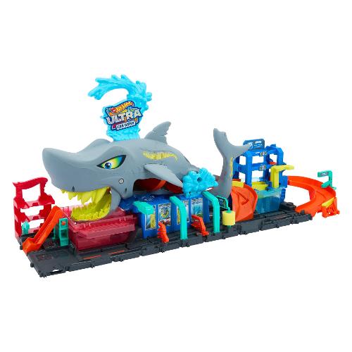 Tuffati in Hot Wheels City Autolavaggio Mega Squalo per un gioco interattivo cambia colore in un'ambientazione della serie Netflix 'Let's Race!'. Il playset a tema autolavaggio presenta dettagli realistici come un rullo in schiuma e cancelli mobili per creare tantissime storie. Lancia il veicolo nella bocca dello squalo e premi sulla sua testa per attivare la prima trasformazione. L'acqua cambia il colore quando rimuovi la vernice speciale Color Reveal, rivelando la dolce decorazione dell'auto! Solleva lo squalo e guarda l'auto sfrecciare lungo la pista passando al suo interno. Un'apertura sul ventre consente di vedere i progressi dell'auto. Riempi il serbatoio successivo con acqua fredda e immergi l'auto per cambiare di nuovo la decorazione. Per farlo tornare al colore originario, riempi il primo serbatoio con acqua molto calda e sfreccia di nuovo.