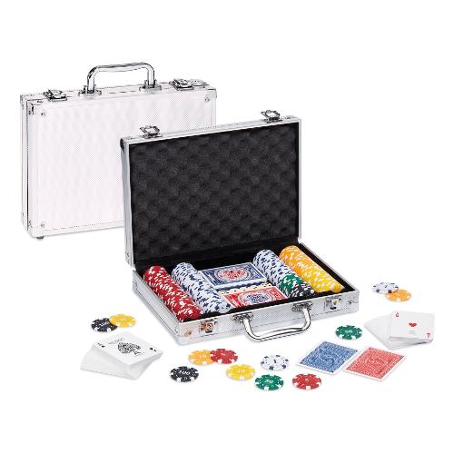 set gioco in valigetta alluminio che include: 200 Fiches in 4 colori, 2 mazzi da poker Magic Byke, 5 dadi comuni.