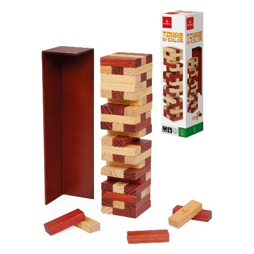 Torre è un gioco tradizionale di abilità , in questa versione con mattoncini in legno scuro e chiaro. Supporto incluso.