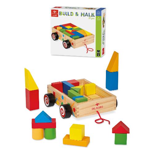 Carrellino da usare come trainabile, contenente 21 pezzi in legno di diversi colori e dimensioni, per giocare a costruire secondo la fantasia.