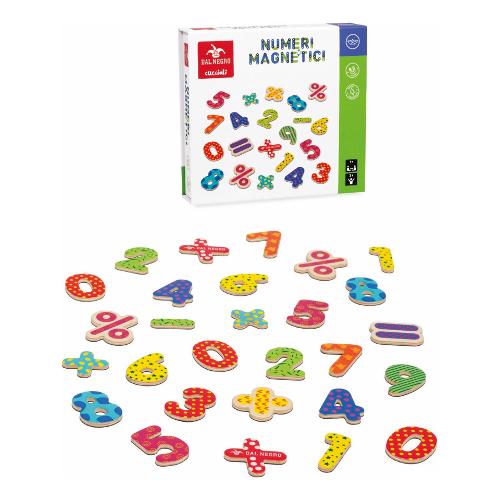 Magneti in legno con numeri e segni matematici per giocare e imparare in allegria. La scatola è a chiusura magnetica per riporre comodamente i magneti.
