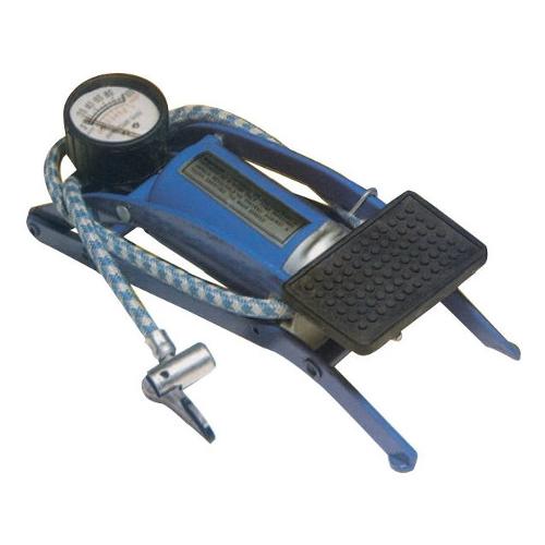 Pompa pedale con un cilindro con manometro per controllo pressione da Kg/cm2 0 a 7 completa di tubo in gomma con testina per gonfiaggio pneumatici