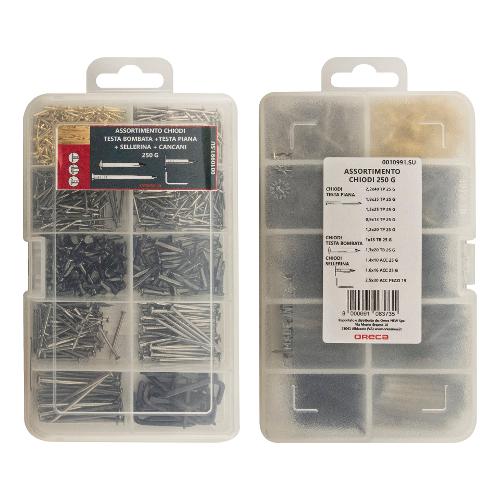 Astuccio trasparente 10 scomparti con assortimento 250 gr misure e finiture varie chiodi testa piana, testa bombata, sellerina e cancanetti
