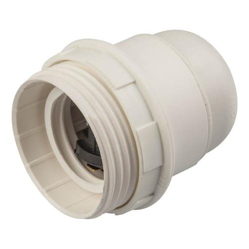 Portalampada in materiale plastico 250 V, attacco E27 con ghiera, corpo parzialmente filettato. Corrente nominale: 4 A. Massima temperatura d’esercizio: 180 °C. Morsetti a vite e contatti in ottone