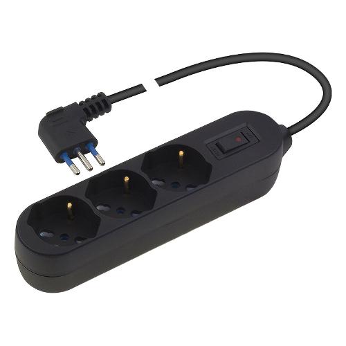 Presa multipla multisize prese pluristandard 10/16a, spina 10a e interuttore sicurezza - presa multipla 250 v~ con 3 prese "grandi" pluristandard 10 / 16 a 2p+t, standard italiano 10 / 16 a e tedesco 16 a (con terra laterale) - 1,5 m cavo h05vv-f 3 x 0,75mm² con spina "piccola" salvaspazio 10 a 2p+t, interruttore di sicurezza - in caso di sovraccarico superiore ai 2300 watt l'interruttore interviene in modo automatico togliendo l'alimentazione ai dispositivi collegati - dopo pochi secondi agendo sempre sull'interruttore è possibile ripristinare l'alimentazione - spegnendo l'interruttore è inoltre possibile risparmiare energia elettrica ed eliminare lo stand-by dei dispositivi elettronici - le prese pluristandard consentono il collegamento di tutte le spine standard italiano e tedesco, essendo inoltre inclinate di 45° facilitano l'inserimento di più spine ingombranti (es. alimentatori).