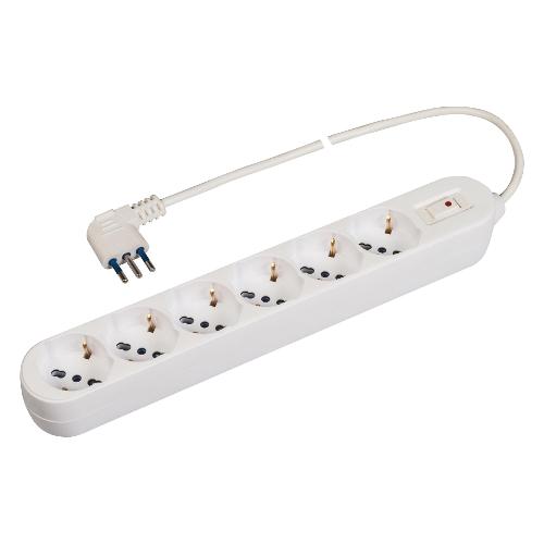 Prese multiple multisize prese pluristandard 10/16a, spina 10a e interuttore sicurezza - presa multipla 250 v~ con 6 prese "grandi" pluristandard 10 / 16 a 2p+t, standard italiano 10 / 16 a e tedesco 16 a (con terra laterale), 1,5 m cavo con spina "piccola" salvaspazio 10 a 2p+t, interruttore di sicurezza. Colore: bianco. In caso di sovraccarico superiore ai 2500 w l'interruttore interviene in modo automatico togliendo l'alimentazione ai dispositivi collegati. Dopo pochi secondi agendo sempre sull'interruttore è possibile ripristinare l'alimentazione. Spegnendo l'interruttore è inoltre possibile risparmiare energia elettrica ed eliminare lo stand-by dei dispositivi elettronici. Le prese pluristandard consentono il collegamento di tutte le spine standard italiano e tedesco, essendo inoltre inclinate di 45° facilitano l'inserimento di più spine ingombranti (es. alimentatori).