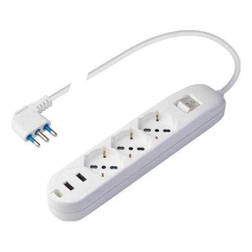 Presa multipla 250 v~ con 3 prese bivalenti 10 / 16 a 2p+t standard italiano 10 / 16 a e tedesco 16 a con terra laterale, 2 prese usb con corrente massima 2,4 a, uscita 5 vdc, 1,5 m cavo con spina 16 a 2p+t, interruttore luminoso. Colore: bianco. Permette di collegare alla stessa multipresa più apparecchi e contemporaneamente alimentare due dispositivi usb. La presa usb è ideale per caricare cellulari, smartphone, tablet, e altri dispositivi elettronici. Le prese pluristandard consentono il collegamento di tutte le spine. Spegnendo l'interruttore è inoltre possibile risparmiare energia elettrica ed eliminare lo stand-by dei dispositivi elettronici.