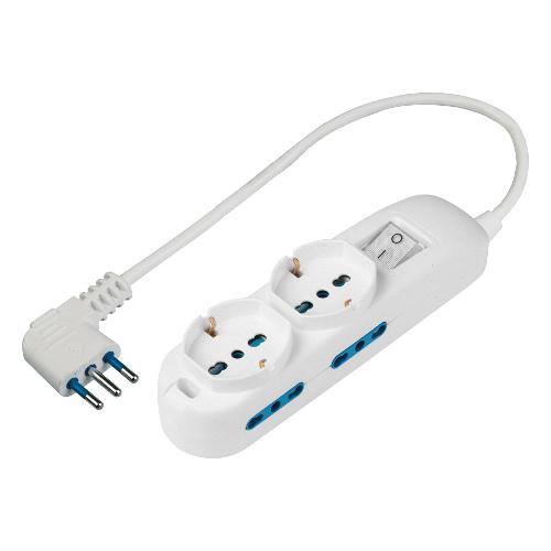 Presa multipla con 4 prese e interruttore luminoso.Le Prese pluristandard consentono il collegamento di tutte le spine standard italiano e tedesco, essendo inoltre inclinate di 45° facilitano l’inserimento di più spine ingombranti (es. alimentatori). Spegnendo l’interruttore è inoltre possibile risparmiare energia elettrica ed eliminare lo stand-by dei dispositivi elettronici