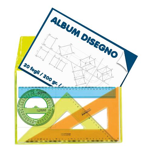 Custodia con gli articoli indispensabili per il disegno tecnico. Per ogni pezzo è prevista la sua sede e sul retro è posizionata una tasca nella quale riporre l'album da disegno.