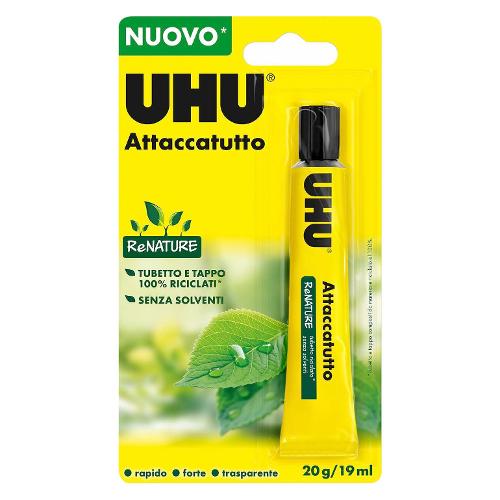Uhu attaccatutto senza solventi è il moderno, potente liquido attaccatutto ad elevata tenuta. Incolla con la stessa forza del classico uhu attaccatutto extra gel. Ideale per l’ufficio, la scuola, l’asilo ed a casa. Asciuga in fretta, è inodore e è lavabile quando bagnato. Incolla vari materiali, incluso il polistirolo® ed il pvc. Una volta applicato, le superfici possono essere riposizionate per alcuni minuti. Fissaggio permanente di materiali quali carta, cartone, feltro, tessuto, pellicola, legno, pelle, polistirolo e molti altri materiali plastici