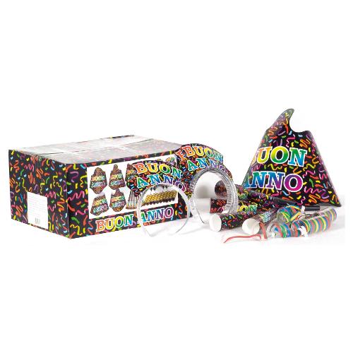 Composto da 12 cappellini, 8 tiare, 20 trombette e 20 stelle filanti