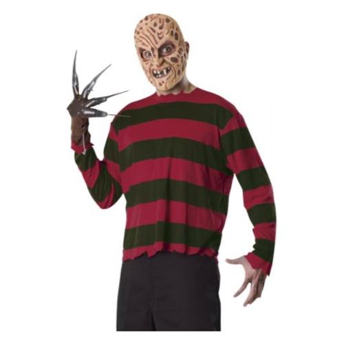 Kit freddy krueger per adulti, per vestirsi come lo psicopatico paradigmatico del cinema horror adolescenziale degli anni '80, a nightmare on elm street. Costume composto da maglietta, maschera in lattice e guanto con lame