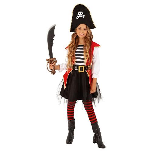 Costume da piratessa con tutù per bambini composto da cappello, camicia con gilet e gonna tutù, cintura. Invita i tuoi amici a creare un gruppo di pirati alla ricerca di tesori nascosti. Esci in mare aperto per esplorare nuove terre dove le ricchezze sono nascoste e sarai il primo a trovarle. Ideale per compleanni, halloween e feste in costume.