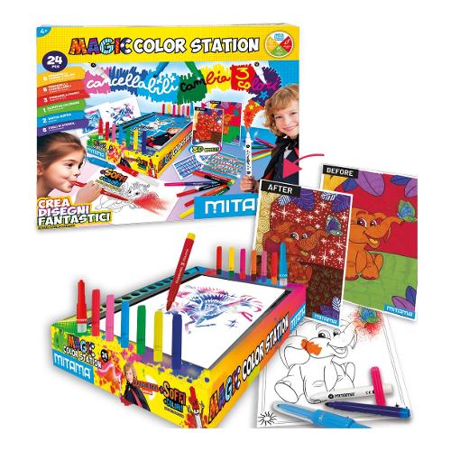 Scatola gioco multi attività per creare disegni fantastici, cambia e cancella i colori con i pennarelli magici, usa i stencils e l'album per creare pezzi d'arte e se vuoi più colore usa l'aerografo. Più soffi...più colora!