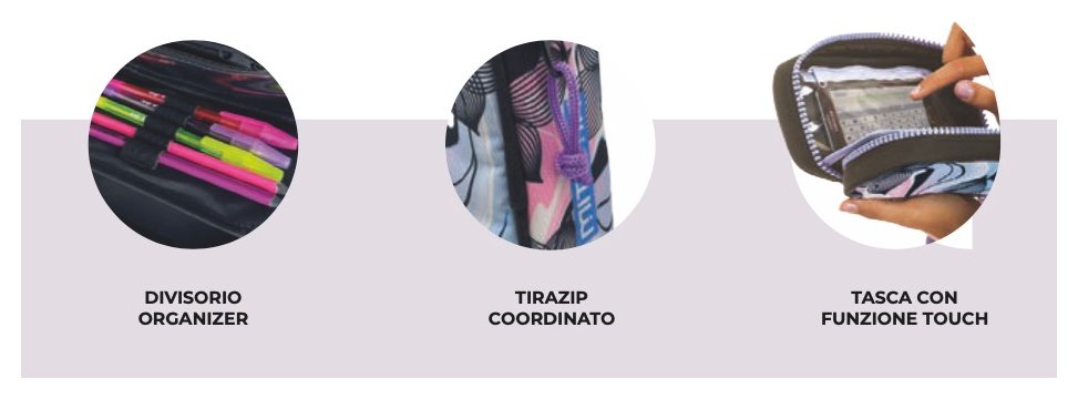 L’astuccio ovale con contenuto fluo non passa inosservato! Struttura imbottita, megazip e all’interno tasca porta smartphone.