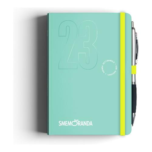 Agenda con elastico piatto, segnalibro e penna inclusa. Gli angoli sono arrotondati.