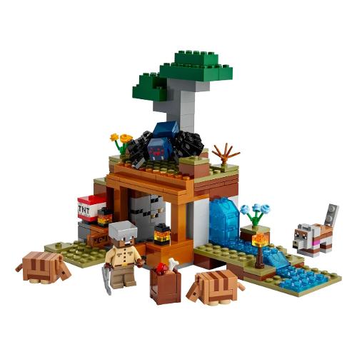Ambientato nel bioma della savana del gioco, il modello presenta una miniera con una funzione di esplosione controllata da una leva che consente di far saltare in aria un pezzo di terreno per rivelare il prezioso minerale. C’è un ragno delle caverne giocattolo e un lupo, più 2 armadilli, che forniscono lo scuto necessario per craftare l’armatura del lupo. A lato della miniera ci sono un piccolo fiume e una cascata di lava.Il Set si riorganizza facilmente per ispirare nuove avventure. Per un divertimento ancora più digitale, l’app lego builder consente ai bambini di ingrandire e ruotare i modelli in 3d utilizzando il proprio dispositivo.