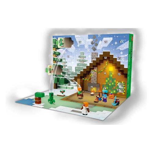 Dietro ciascuna delle 24 porte c’è un regalo quotidiano che i bambini possono scoprire durante il periodo che precede il Natale. Le minifigure includono Alex con un maglione di Creeper™ e Steve che indossa un maglione con un pupazzo di neve e un elmo di diamanti, più un piccone; altre sorprese includono un rampicante vicino a un cespuglio di bacche dolci, un annegato con un tridente, uno stray con un’armatura di diamanti, un golem di neve, uno zombi con un’ascia incantata, e un abitante Babbo Natale con una fornace. Ci sono anche tanti piccoli giocattoli da costruzione e fantastici accessori che i bambini riconosceranno dal popolare gioco. Con l’avvicinarsi del grande giorno, i bambini possono combinare i regali per creare un micro villaggio invernale Minecraft e infinite avventure di fantasia. C’è anche un tappetino da gioco pieghevole per creare lo sfondo perfetto.