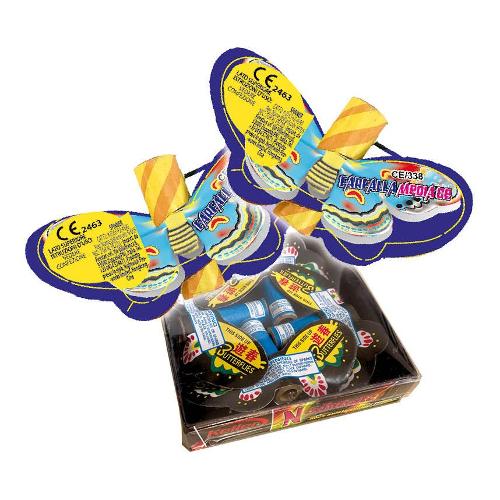 Informazioni di sicurezza: da usare esclusivamente all’aperto. Appoggiare singolarmente su un suolo piano posizionando correttamente il lato alto del prodotto ed accendere la miccia alla estremità. Allontanarsi immediatamente di almeno 8 metri. Attenzione: la girandola vola in alto!
