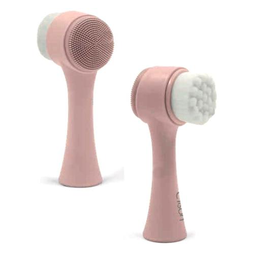 Spazzola viso bifase: lato con texture silicone per massaggio esfoliante e lato con setole morbide per detersione profonda. Manico ergonomico
