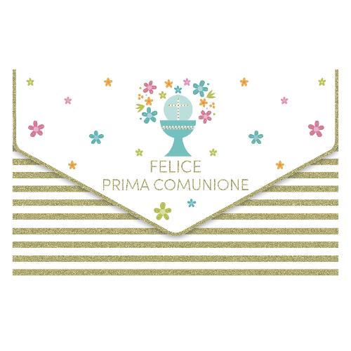 Biglietto auguri prima comunione in cartoncino con foil oro. Busta portasoldi inclusa