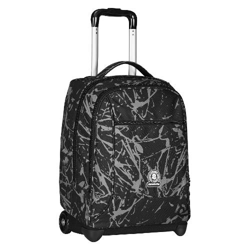 Tessuto 100% poliestere riciclato rPET, spallacci imbottiti e rivestiti a scomparsa nello schienale se usato come trolley, schienale imbottito e rivestito. Ruote 75 mm, asta telescopica alluminio. Fondo rigido preformato integrato