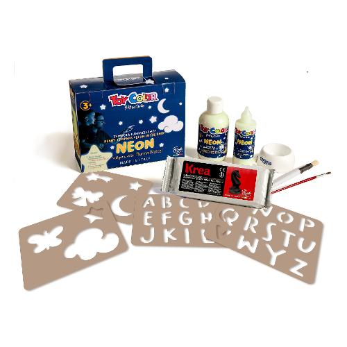 Confezione 1 flacone 250 ml e 100 ml tempera neon superlavabile, pasta modellabile 500 gr. krea nero, 1 barattolo portacolore, 1 pennello, grosso e 1 pennello fine, 4 stencil