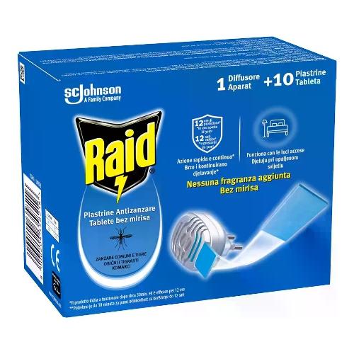 Raid® Piastrine Zanzare grazie alla sua formulazione offre un'azione prolungata e una protezione costante contro le zanzare comuni (Culex pipiens) per tutta la notte*(12 h) e contro le zanzare tigre (Aedes albopictus) durante il giorno. E’ un Presidio Medico Chirugico