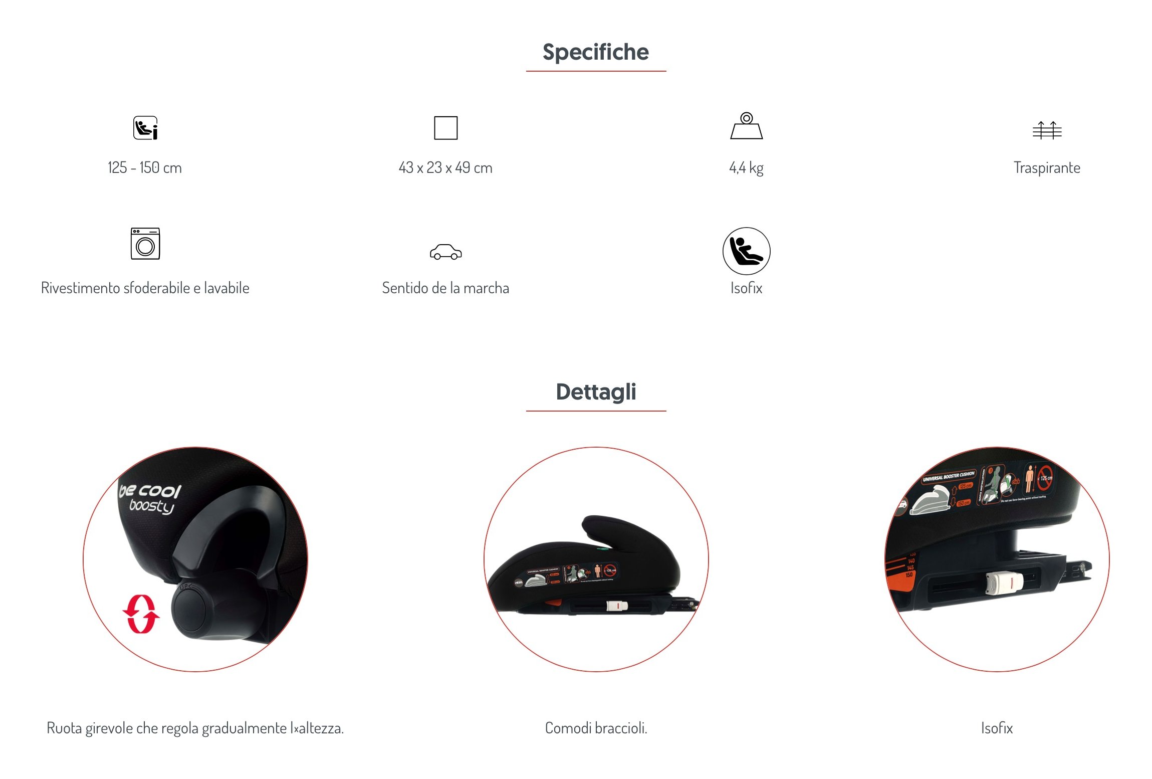 Boosty è la scelta ideale per le auto con airbag a tendina e laterali. E' possibile regolare laltezza in modo ottimale in ogni fase della crescita da 125 cm a 150 cm. Uso nella direzione di marcia. Il sistema di ritenuta è la cintura abc dell'auto. La seduta è ancorata al sedile dellauto tramite isofix, anche se la sua installazione è anche consentita senza lisofix.
