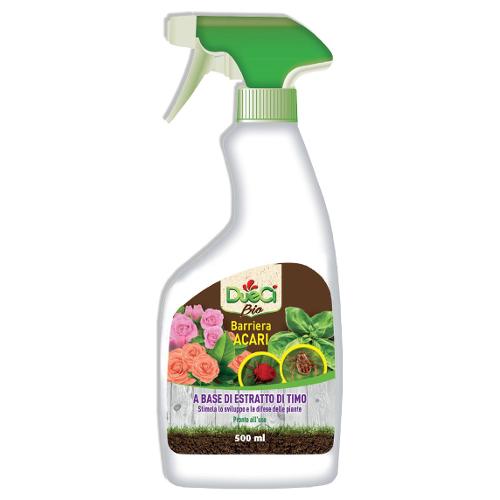 Dueci acari è un prodotto a base di estratto di timo ottenuto dalla ricerca dueci nel campo della protezione naturale delle piante. L’estratto di timo è noto per la sua efficacia nello sviluppo naturale delle piante a fronte di stress biotici causati da acari, tetranichidi e eriofidi. Dueci acari non necessita di alcuna diluizione in quanto è un prodotto pronto all’uso. Agitare bene prima dell’uso. Bagnare uniformemente la pianta ed evitare il gocciolamento. Si consiglia di eseguire il trattamento durante le ore serali. Il prodotto è utilizzabile su colture orticole, frutticole e piante ornamentali. Non miscelare dueci acari con prodotti rameici, zolfo, prodotti a reazione alcalina, prodotti a base oleosa.