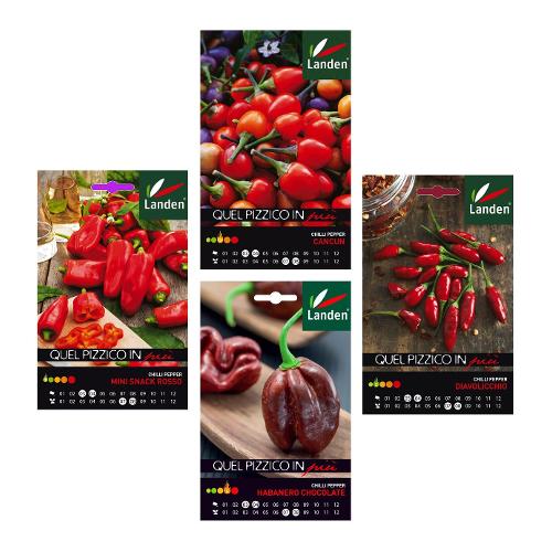 Sempre più ricca ed esclusiva la linea quel pizzico in più. Tante varietà di peperoncini dai dolci ai piccantissimi, vero appagamento per i palati esigenti. Landen propone solo sementi di qualità per sperimentare nuovi sapori e abbinamenti e stupire in cucina.