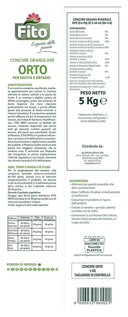 Concime organico per orto è un concime completo, equilibrato, studiato appositamente per nutrire in maniera ottimale le colture orticole e le piante da frutto. È un concime a duplice azione: a effetto prolungato, grazie alla presenza di azoto organico che viene rilasciato gradualmente nel tempo; a pronto effetto grazie alla presenza di azoto minerale a rilascio immediato. È un concime completo perché efficace sia per la preparazione del terreno, sia in fase di fioritura e fruttificazione.