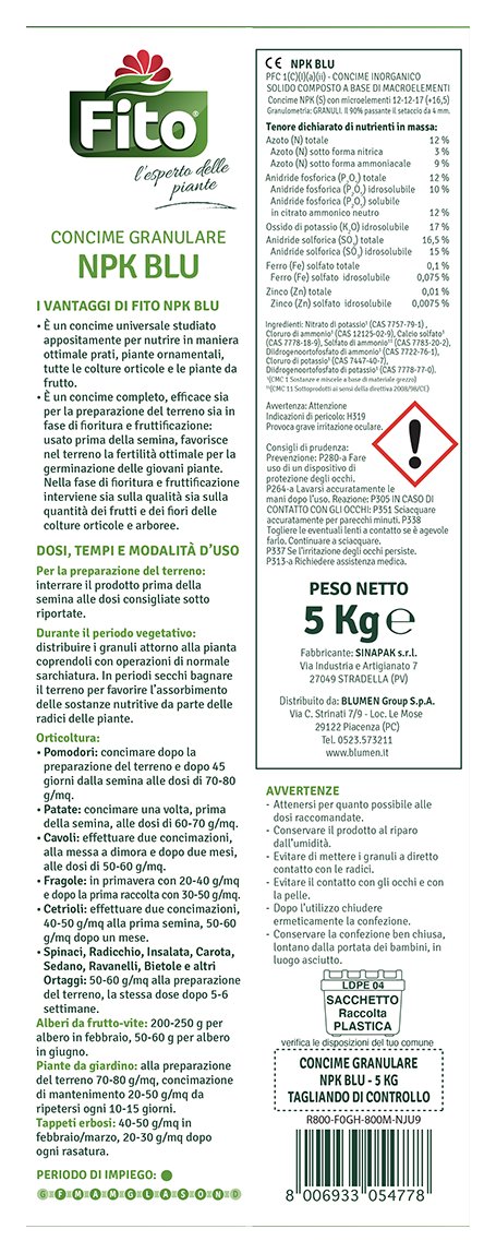 Concime npk blu è un concime minerale composto npk (s) 12-12-17 (16,5) + ferro (fe) + zinco (zn).