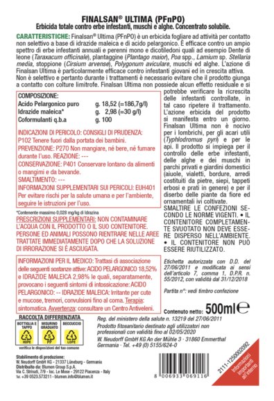 Finalsan ultima è un erbicida fogliare ad attività per contatto non selettivo a base di idrazide maleica e di acido pelargonico. È efficace contro un ampio spettro di erbe infestanti annuali e perenni mono e dicotiledoni, quali ad esempio dente di leone (taraxacum officinale), plantaggine (plantago maior), poa spp., Lamium sp. Stellaria media, stoppione (cirsium arvense), polygonum aviculare, muschi ed alghe. L’azione di finalsan ultima è particolarmente efficace contro infestanti giovani ed in crescita attiva. Non è selettivo e pertanto durante i trattamenti è necessario evitare che il prodotto giunga a contatto con colture limitrofe. Non possiede alcun effetto residuale e si potrebbe verificare la ricrescita delle infestanti controllate, in tal caso ripetere il trattamento. L’azione erbicida del prodotto si manifesta entro un giorno. Non è nocivo per i lombrichi, per gli acari utili e per le api. Impiegate il prodotto alla dose di 200 ml per litro d’acqua, distribuendo per ogni metro quadro di superficie da trattare 100 ml della soluzione ottenuta. Utilizzate finalsan ultima in caso di erbe infestanti annuali e perenni mono e dicotiledoni, quali ad esempio dente di leone (taraxacum officinale), plantaggine (plantago maior), poa spp., Lamium sp. Stellaria media, stoppione (cirsium arvense), polygonum aviculare, muschi ed alghe. In caso di ricrescita delle infestanti, ripetete il trattamento a distanza di 30-60 giorni dall’ultimo. Potete utilizzare finalsan ultima con un massimo di 2 applicazioni all’anno.
