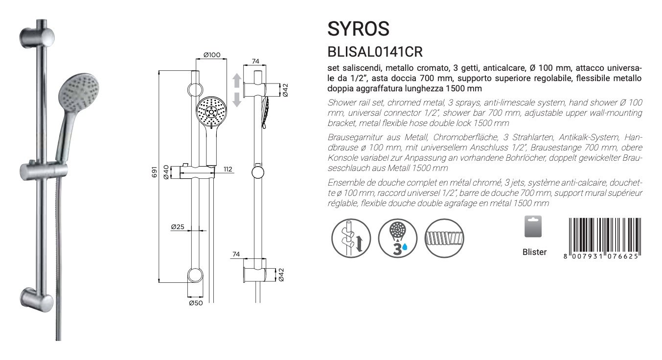 Set saliscendi con doccia 3F (69,1cm) SYROS Cromo BLISAL0141CR