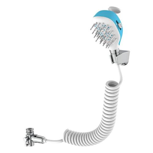 Duplex per pulizia animali, doccia abs/silicone, finitura azzurro/bianco, 2 getti: pioggia e getto lavaggio, vano integrato per aggiunta shampoo, lo shampoo si miscela al getto lavaggio, ugelli massaggianti che facilitano il lavaggio, flessi- bile a molla estensibile in pvc rinforzato 200 cm, supporto doccia fissaggio con viti e tasselli inclusi, deviatore con aeratore in metallo 22/1f con riduzione 24/1m