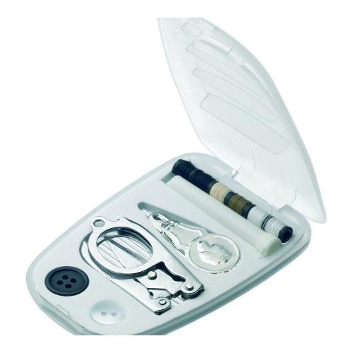 Comprende aghi, cotone, bottoni, spille di sicurezza, forbici pieghevoli e un infila ago