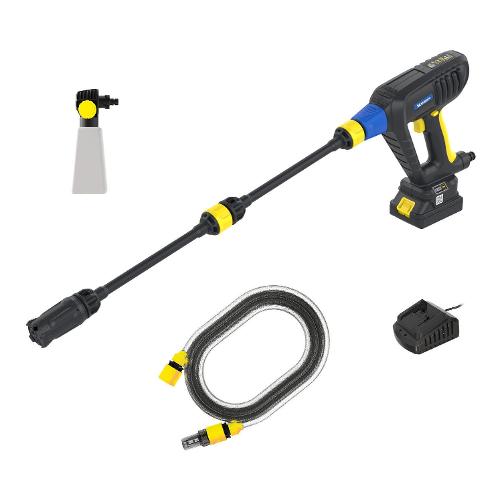 Idropistola portatile a batteria, pratica e leggera che consente di pulire efficacemente i veicoli e le superfici esterne tramite il getto d'acqua ad alta pressione, ma senza la necessità di lunghi tubi da giardino, né di cavi elettrici: basta collegarla a qualsiasi fonte d'acqua dolce come piscina, lago o persino un secchio ed è subito pronta all'uso. Risulta quindi perfetta per la pulizia di auto, camper, camion, barche e anche in numerose situazioni di outdoor living come il campeggio, le escursioni, il lavaggio dei veicoli durante i viaggi. La batteria al litio (18V) con indicatore di carica è ricaricabile e ha un'autonomia di 21min. Dotata del sistema Double Speed: è possibile modulare le performance dell'idropistola. Pressione 24bar, portata 175l/h. In dotazione: ugello 4 in 1 (permette di modificare il getto da regolabile a rotante), prolunga pistola doppia, kit schiumogeno, kit autoadescamento con tubo 4m, batteria al litio e carica
