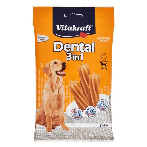 La placca e il tartaro affliggono spesso anche i cani. I deliziosi bastoncini dentali dental 3in1 senza zucchero contengono un'efficace combinazione di principi attivi: - la sostanza stay clean riduce lo sviluppo dei batteri responsabili della formazione della placca. - i pirofosfati aggiunti fissano il calcio presente nella saliva e riducono la formazione del tartaro. - la componente dello zinco previene la gengivite e contribuisce a sanare le lesioni della bocca. - la speciale forma a stella a 6 punte e la consistenza elastica dei bastoncini dentali dental 3in1 consentono una profonda pulizia dei denti e agevolano la rimozione di placca e tartaro.